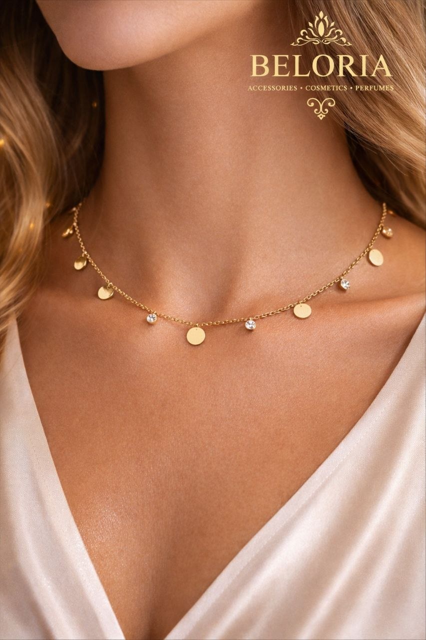 كوليه فرفشة من الاستانلس البيور مطلي بماء الذهب ومزين بفصوص زركون لامعة، مقاوم للصدأ ومناسب للاستخدام اليومي ويكمل اللوك الكاجوال والشيك.