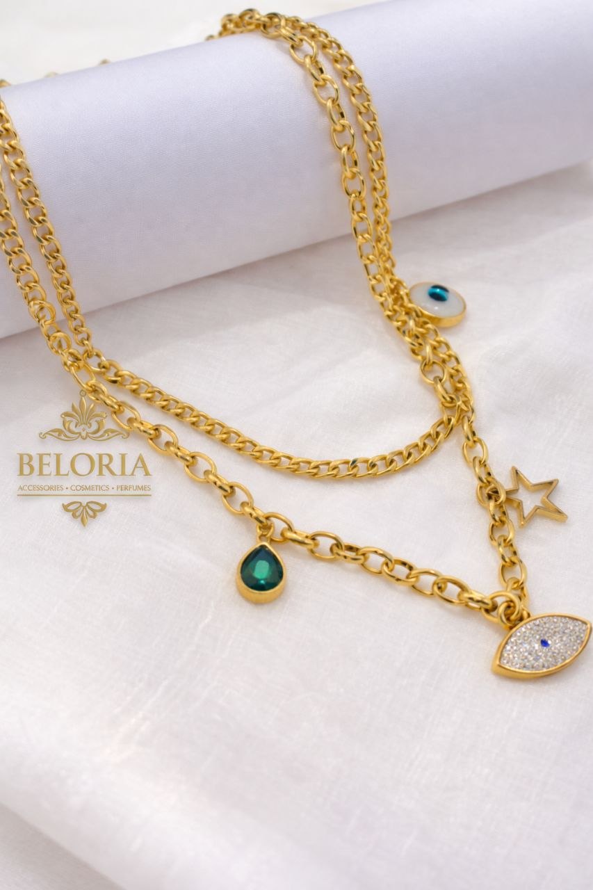 كولية 2 لير بتصميم مميز يضيف لمسة فخامة مختلفة لأي إطلالة. تتكون من دورين بشكل أنيق مع 5 دلايات تضيف تفاصيل راقية ولمسة ستايل ملفتة من أول نظرة، لتكون قطعة مثالية لكل من تحب الإكسسوارات التي تجمع بين الشياكة والتميز.