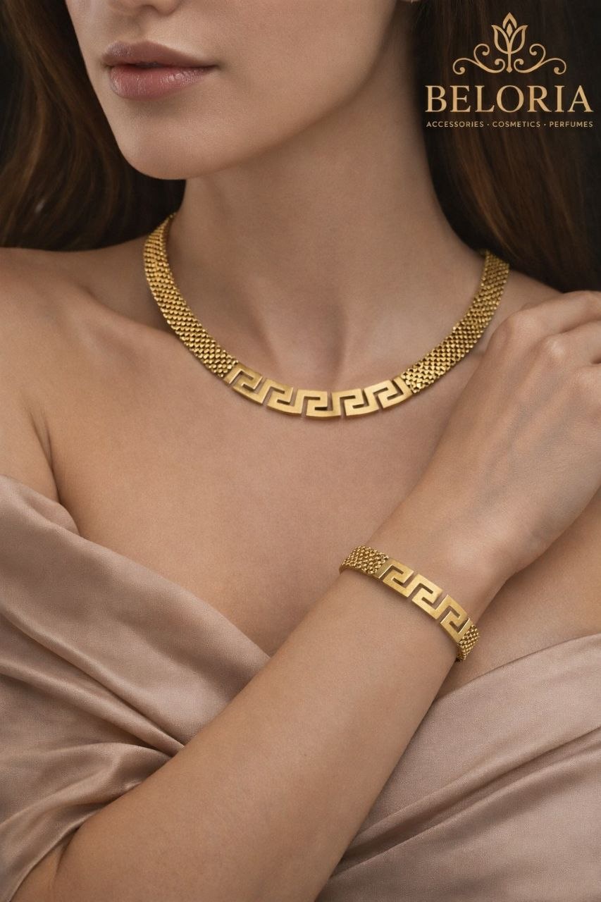 الطقم مصنوع من الاستانلس ستيل البيور ومطلي بماء الذهب بلون ثابت، مما يجعله مقاومًا للصدأ ومناسبًا للاستخدام اليومي مع الحفاظ على شكله الأنيق ولمعته المميزة. يمكن ارتداء كل قطعة بمفردها أو تنسيق الطقم كاملًا للحصول على إطلالة أكثر اكتمالًا وشياكة، سواء في الخروجات أو المناسبات أو حتى مع اللوك اليومي