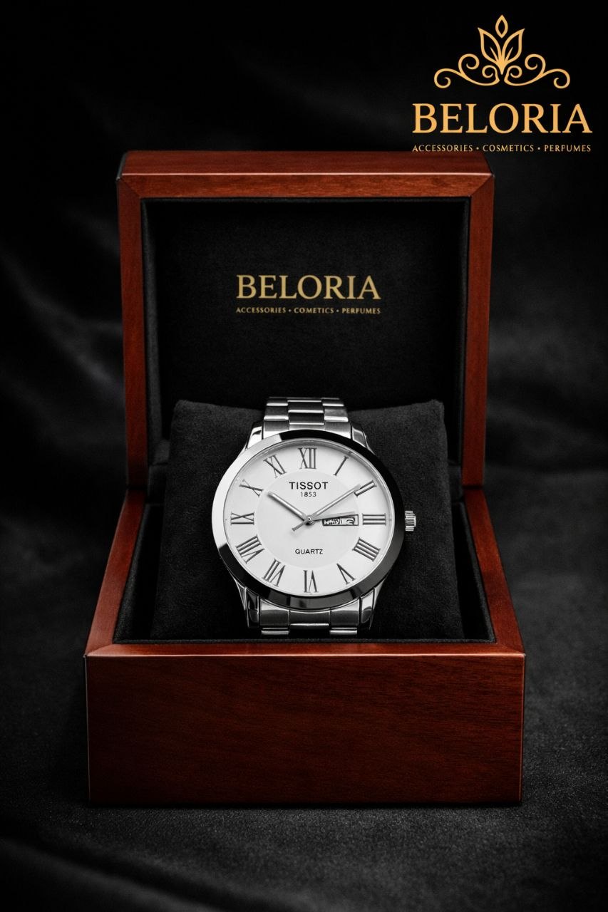 ساعة رجالي ستايل تيسوت من الاستانلس ستيل، مزودة بعداد يوم وتاريخ، بتصميم شيك وعملي مناسب للشغل والخروجات والاستخدام اليومي.
